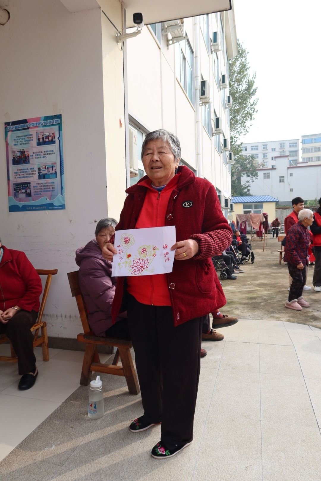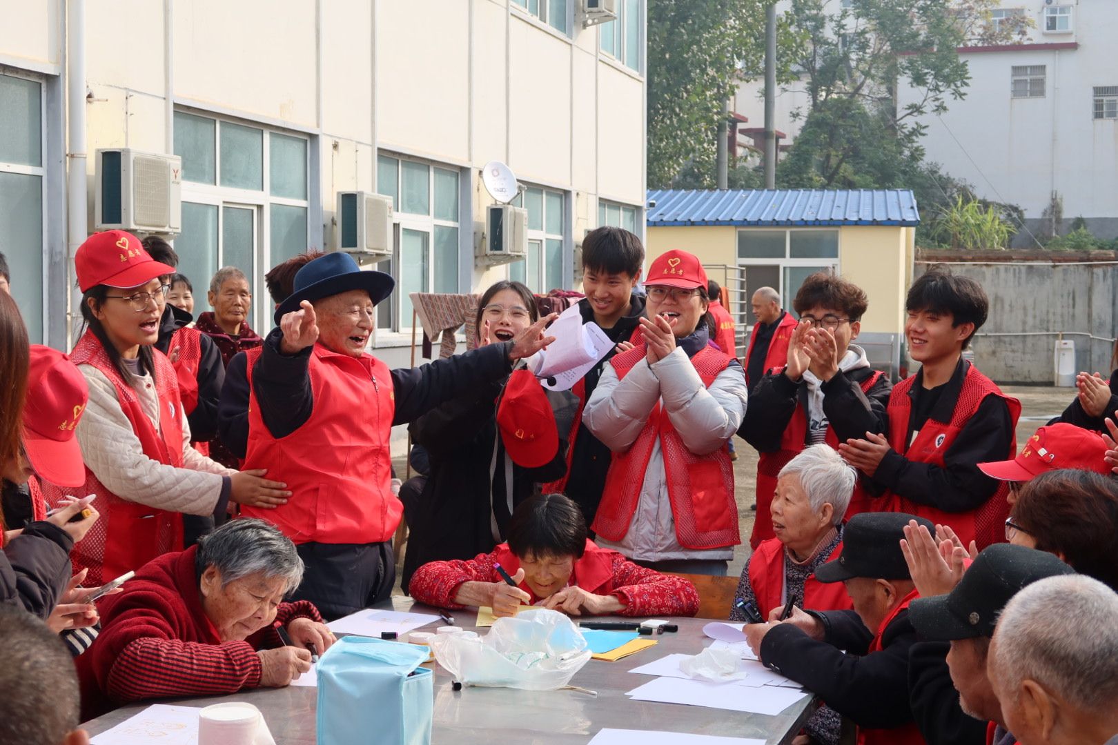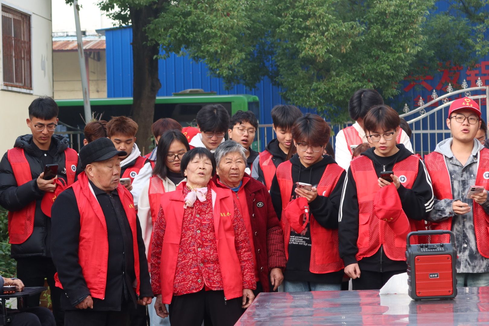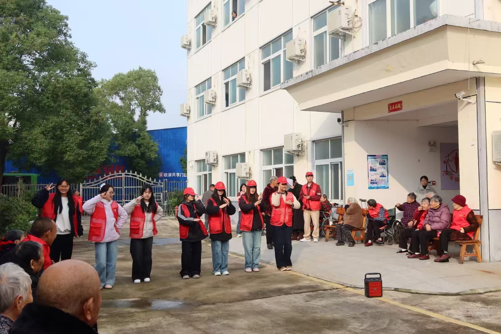 手工绘画的温馨尚未褪去,大合唱环节便顺势登场,将现场氛围推向高潮。随着伴奏响起,经典歌曲《东方红》率先唱响,同学们清亮的嗓音与老人们略带沙哑却饱含深情的歌声交织,不少老人跟着节奏轻轻拍手,眼神里满是对祖国的热爱与对岁月的珍视。紧接着,《大海航行靠舵手》《义勇军进行曲》等耳熟能详的旋律接连响起,曾是音乐老师的爷爷主动起身领唱,同学们默契配合着打节拍,偶尔还会轻声提醒老人歌词。养老院里歌声袅袅、掌声阵阵,暖意顺着旋律流淌在每个角落,连秋风都似被这温情感染,变得柔和起来。