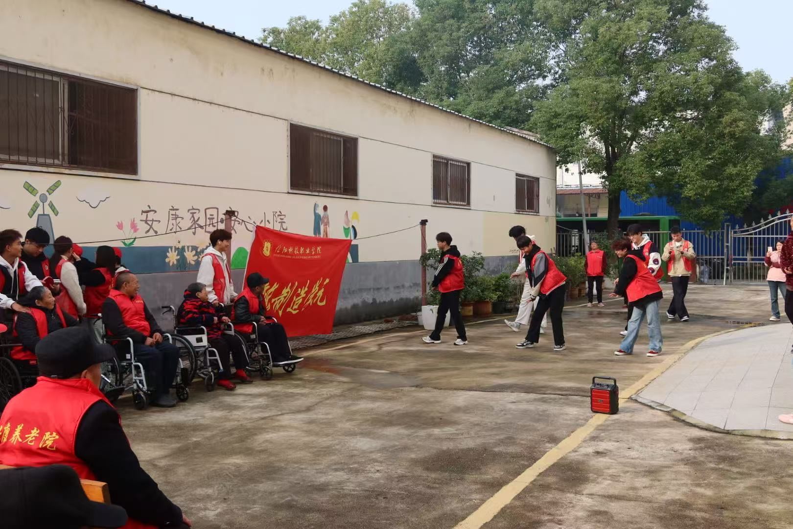 活动当天,学子们提前准备好的舞蹈、歌唱表演和手工绘画等,一到养老院便忙碌起来。大家分工明确,有的主动陪老人坐在庭院里唠家常,倾听老人们讲述过去的故事,耐心询问他们的饮食起居与健康状况;有的拿起扫帚、抹布,细致地打扫养老院公共区域的卫生,擦拭门窗与扶手,让老人的居住环境更加整洁舒适;擅长文艺表演的同学,现场演唱了《最炫民族风》《别怕变老》等歌曲,悠扬的歌声引得老人们跟着节奏轻轻哼唱,不少老人还主动接过学子递来的话筒,与大家共同演唱;还有擅长舞蹈的同学,为大家表演了《斗地主》《桃花朵朵开》《谁是我的新郎》等舞蹈,节奏明快的舞蹈中,同学们脚步轻快、动作利落,笑容洋溢在脸上,感染力十足,瞬间让养老院的氛围变得热闹鲜活。