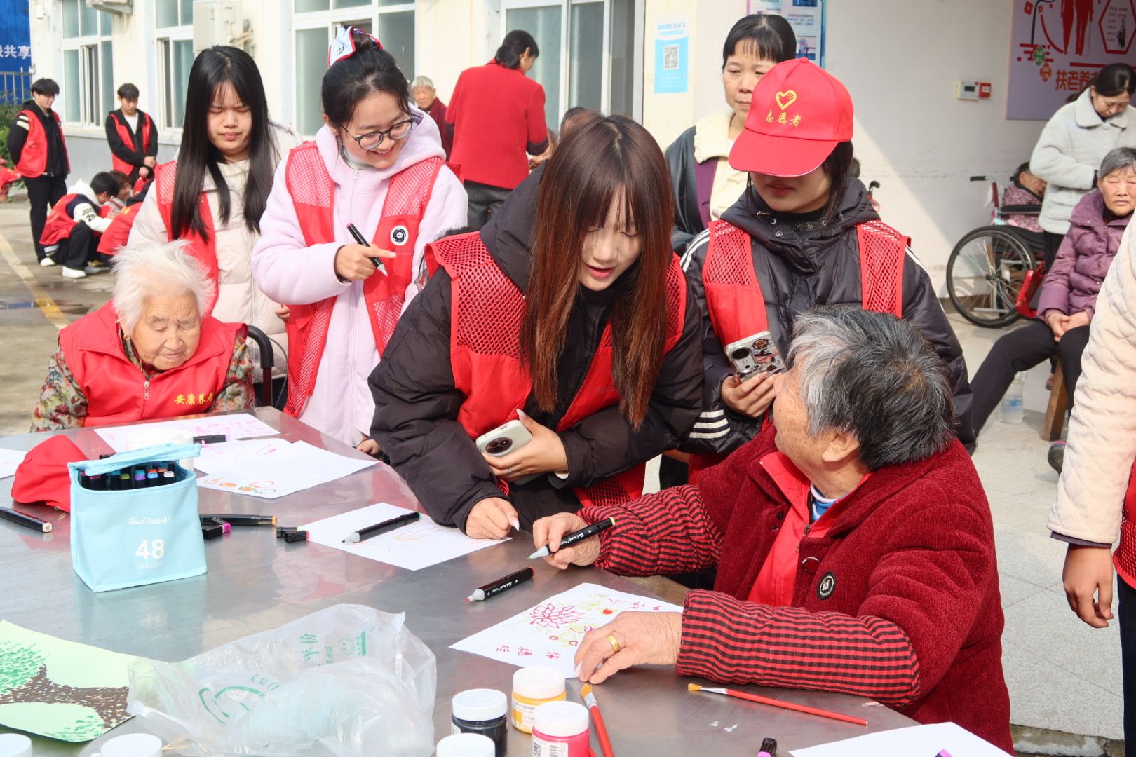 当最后一个舞蹈动作落下,养老院内掌声久久不息。伴随着欢快舞蹈和悠扬歌声的结束,也迎来了手工绘画的环节。同学们将画纸、水彩笔、调色盘、勾线笔等材料分类摆放整齐,还特意准备了菊花、枫叶、夕阳等秋日元素的参考图,方便老人选择。“奶奶,您平时喜欢什么颜色?咱们今天画一幅专属于您的画!”同学们俯下身,轻声与老人沟通,耐心询问他们的喜好。对于手部灵活度欠佳的老人,同学们便手把手指导握笔姿势;对于视力模糊的老人,则逐一向他们介绍色彩名称,协助挑选心仪的颜色。
