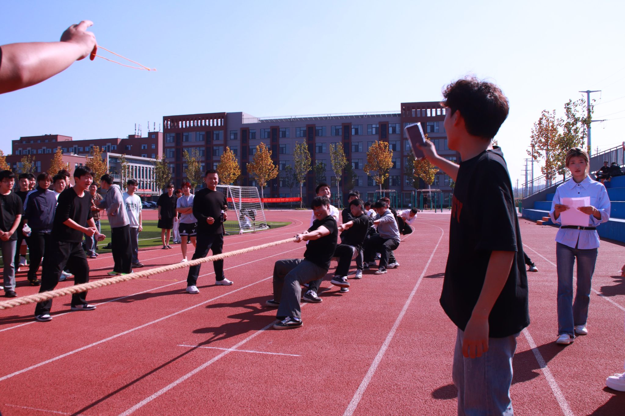 决赛现场气氛热烈非凡,呐喊声、加油声此起彼伏,响彻校园。随着裁判一声哨响,参赛队员们迅速进入状态:双手紧握长绳,身体后倾,脚步扎根,使出浑身解数奋力拉扯。绳子中间的红线在两队之间来回拉锯,每一次移动都牵动着在场师生的心弦。队员们目光坚定、咬牙坚持,汗水浸湿衣衫却丝毫没有松懈,用默契的配合与顽强的毅力诠释着“人心齐,泰山移”的团队精神。